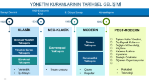 Sanayi devrimi sonrası başlayan Klasik Yaklaşım; iş dizaynı, işbölümü ve verimlilik kavramlarına odaklanırken, insan unsurunu bir makine seviyesinde ele alarak, göz ardı etmiş, fakat Neo-Klasik Yaklaşımlar, özellikle Hawthorne araştırmalarının da etkisi sonucu davranışsal yaklaşımlar ile insan unsurunu öne çıkarmıştır. İkinci Dünya Savaşı sonrası gelişen sistem yaklaşımı ve durumsallık yaklaşımları, çevre ve koşulları önemli bir girdi olarak ele almış Modern Yaklaşımları ortaya çıkarmıştır. 1980’ler sonrası neo-liberalleşme ve küreselleşme ile rekabet ve teknolojinin şekillendirdiği Çağdaş Yaklaşımlar ortaya çıkmıştır.